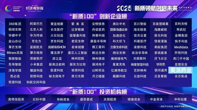 1月30日,《经济观察报》主办的2025年度创新峰会正式发布“新质100创新企业榜”,英派药业凭借合成致死领域的持续创新实力,与各领域头部企业共同入选。